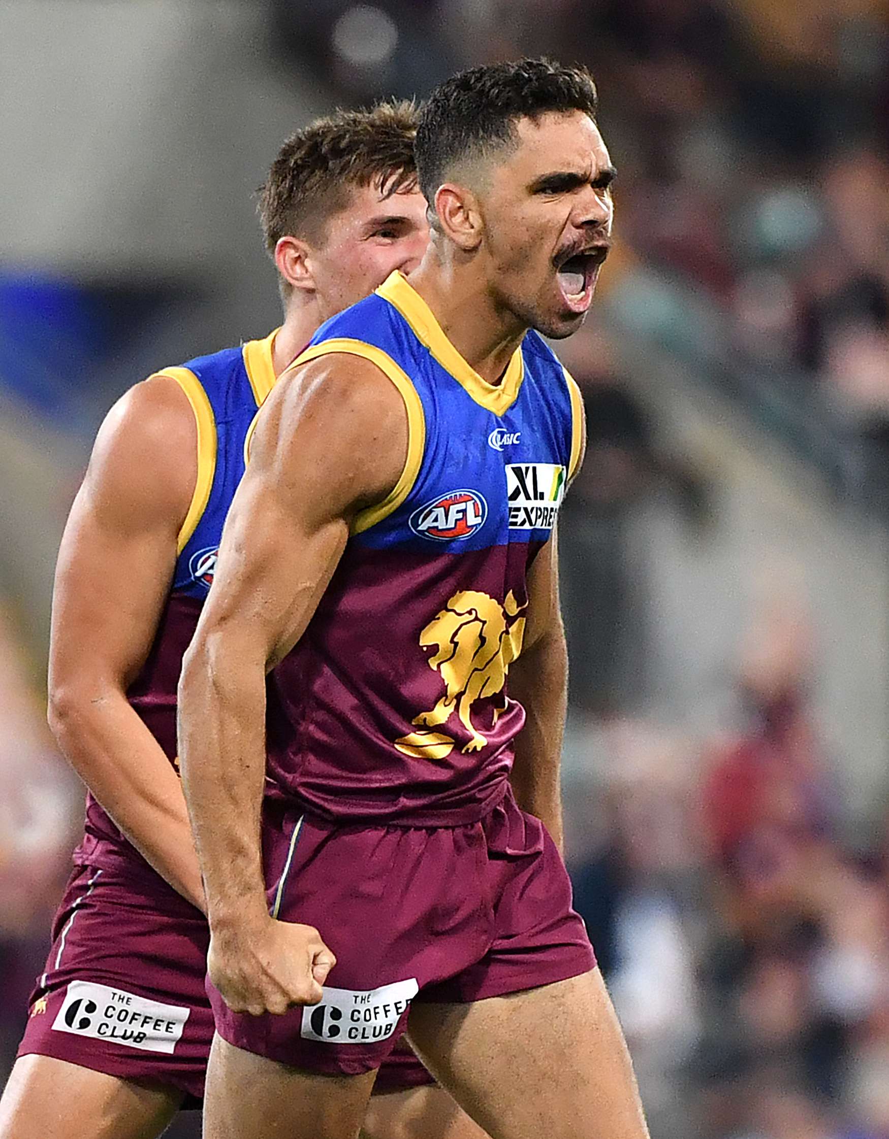 Charlie cameron of the lions celebrates a goal during the round 10 afl match between the richmond tigers and the brisbane lions at metricon stadium.